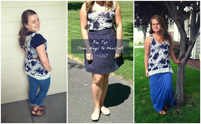 Do you ever find an item that you love, but have no idea how to wear it? I bought this floral tunic tank at Rue 21 last Spring. I was drawn to the bold floral, deep blue color, and crochet edge. It has a great shape, but wasn't exactly sure how to style it at first. Since then, I have had a lot of fun experimenting with different ways to wear it.