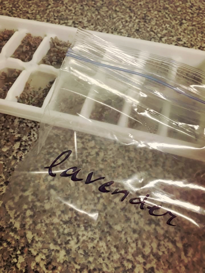 All you have to do is snip small sections of herbs and place them in an ice cube tray, then fill the tray with water, and place it in the freezer for a few hours. Soon you'll have preserved cubes of fresh herbs, just label a ziplock bag and pop them in the freezer. Now you have fresh herbs (or lavender!) to add to smoothies, iced teas, and use for cooking.
